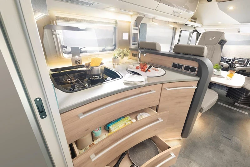 Allied to this eye-watering capacity is a complete commitment to quality: from the delightful décor (with a range of upgrade options) to the superior cabinetry, luxurious beds and delightfully-appointed cab. And when it comes to the daily travel essentials of washing and cooking – you’ll be blown away by the chef-standard kitchen, beautiful bathroom and separate toilet.