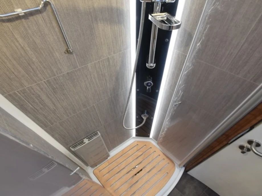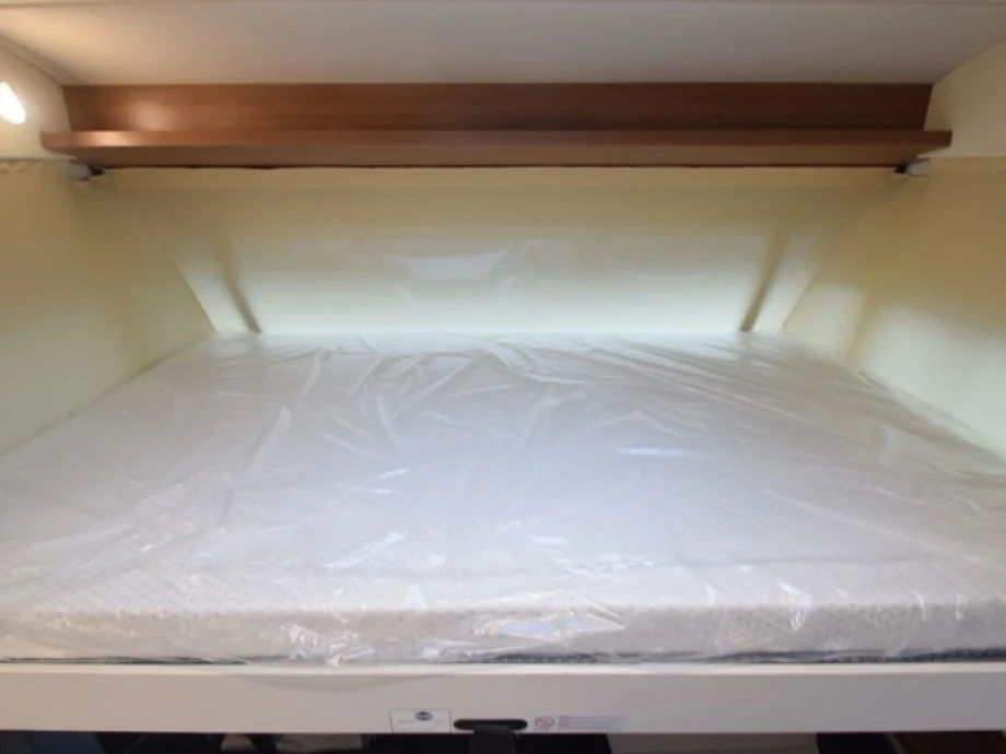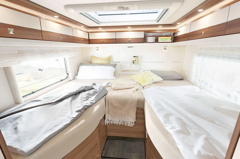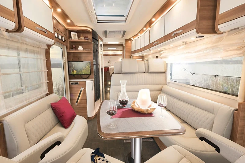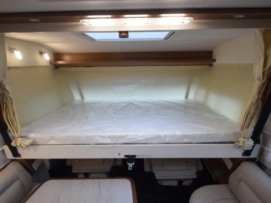 This model sleeps four adults with ease, with single rear beds positioned over the huge rear garage space, plus a traverse double bed over the driver’s cab. Copious natural light from the panoramic windows is enhanced by the advanced ambient lighting, creating a cosy yet roomy experience. For customers with bespoke requirements, options include full-leather interior and an electric awning.