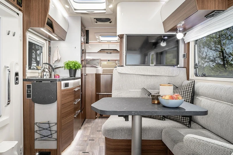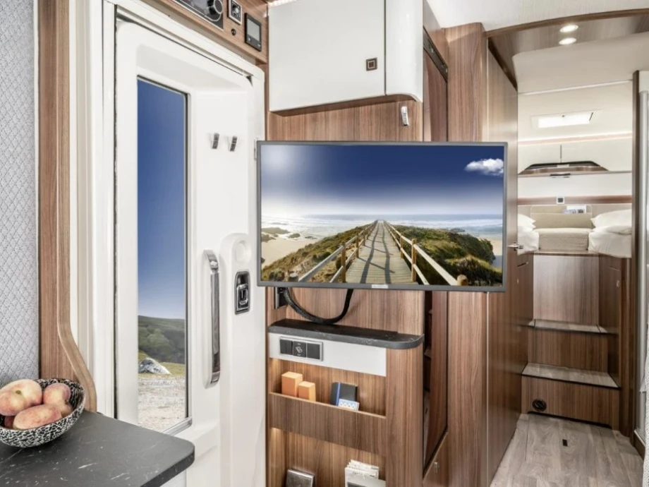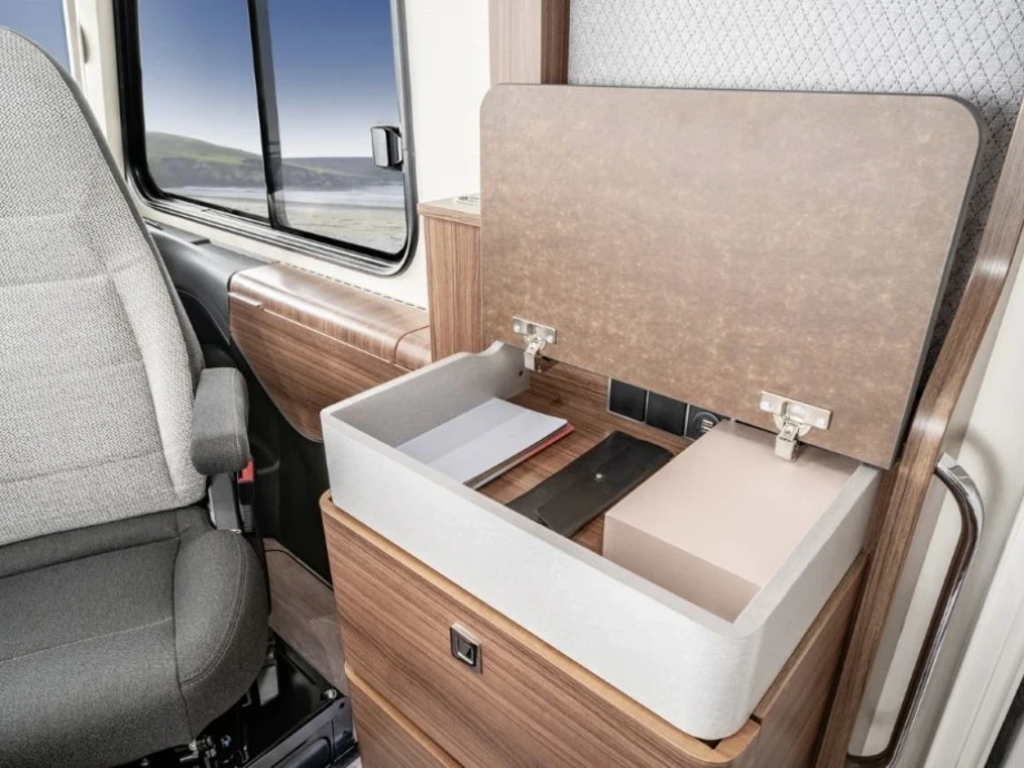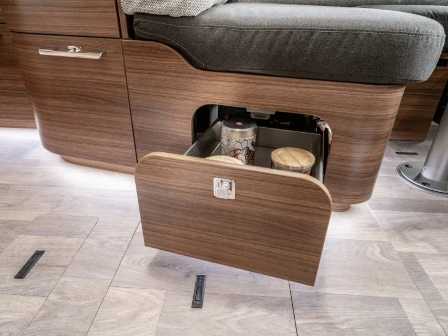 The 680 is beautifully appointed and finished, including a delightful en-suite bathroom incorporating a generous mirror and integrated strip light. The kitchen is similarly impressive with its high-spec cooker and large-capacity fridge freezer making this a delight for foodies on tour! In addition, the multi-purpose double floor offers extra storage space and amazing insulation.