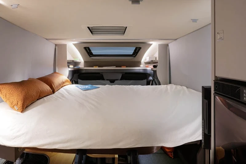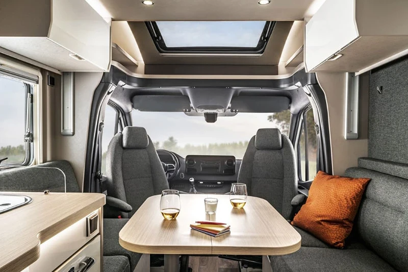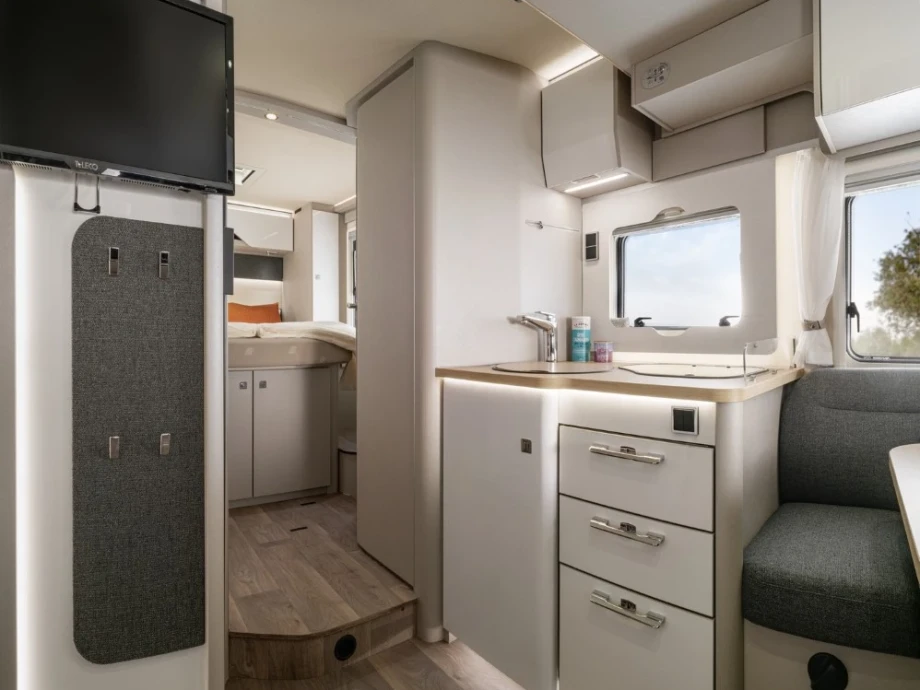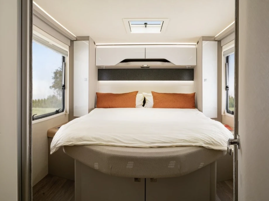 The spacious and superbly engineered floorplan creates room for driving, living, dining and sleeping in ultimate comfort and style. Should you want to customise it to your individual taste, there are almost infinite options available too, such as half-leather upholstery and additional beds. With its sleek modern exterior, this is a motorhome you’ll never want to leave.