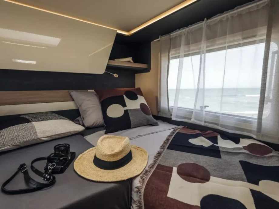 This impressive motorhome scores highly on the practical side too. With a generous lounge area and robust, adjustable table, meal times and socialising are well catered for. There’s no end to smart space-saving and hidden storage solutions to keep everything tidy, while the mighty rear garage, with its integral light and power, can accommodate just about everything you need.