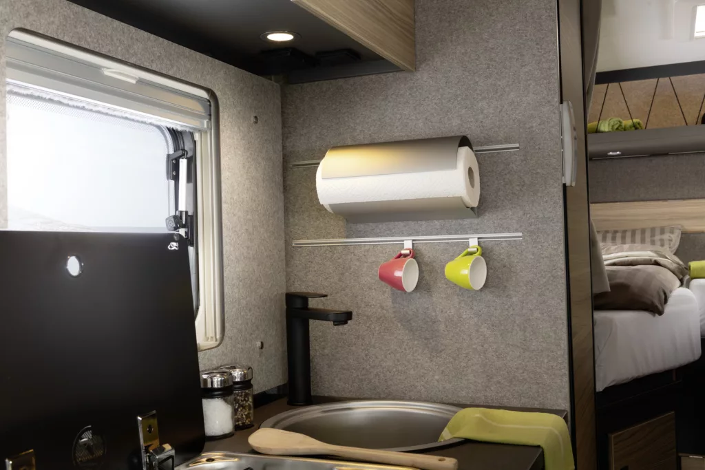 Sound-absorbing, breathable fabric wall panelling enhances the interior with a calm and pleasant atmosphere. The well-equipped kitchen offers generous shelving, a fixed tap, and large handle less drawers with a central locking system to keep everything secure. A 131-litre compressor fridge comes as standard, providing ample space for all your essentials.