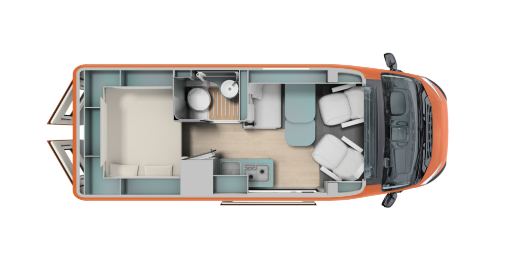 Available in 3 colours – Verde Mugello, Arancio Sicilia and Azzurro Capri. With features like a Maxi panoramic roof-light over the lounge, insulated composite walls and ceiling, a flexible rear double bed (196×150/138 cm) plus a dinette bed (182×83/77 cm), ESC/ABS/ASR stability systems, diesel combi heating, and a 95 Ah living-area battery, it blends high performance and elegant comfort for any journey.