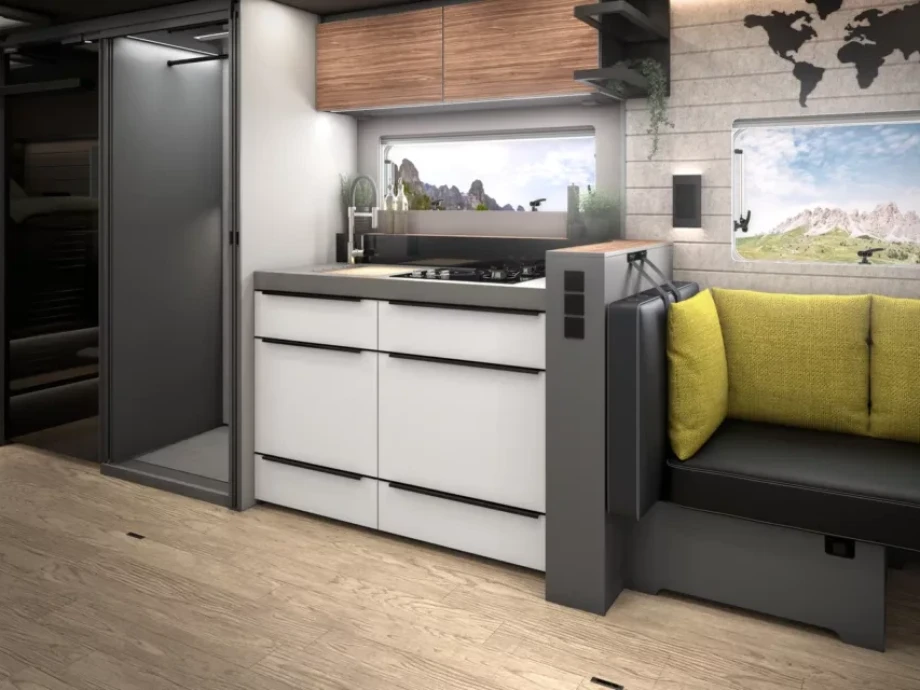 When it comes to the perfect kitchen, flexibility is key. The new Arto 84 delivers just that, with a hybrid cooker as standard and options ranging from ovens to dishwashers – so you can choose exactly what suits your lifestyle. With clever touches like a retractable extractor hood and smart storage solutions, the Arto 84 kitchen combines practicality with elegance, making it ideal for those who love to cook while on the road.