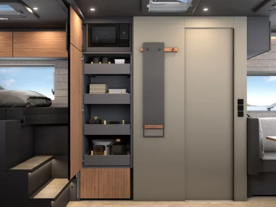 The Arto 88 has been innovatively designed to utilise every last bit of space, while maintaining the luxurious atmosphere guaranteed with the Niesmann+Bischoff range. The freestanding sink in the Arto 88 adds a touch of elegance to the vehicle, while also being practical and providing an additional element of space for the separate shower and toilet area. This well thought out design ensures that every corner of the vehicle is maximized for functionality without compromising on the high standards of luxury synonymous with Niesmann+Bischoff.